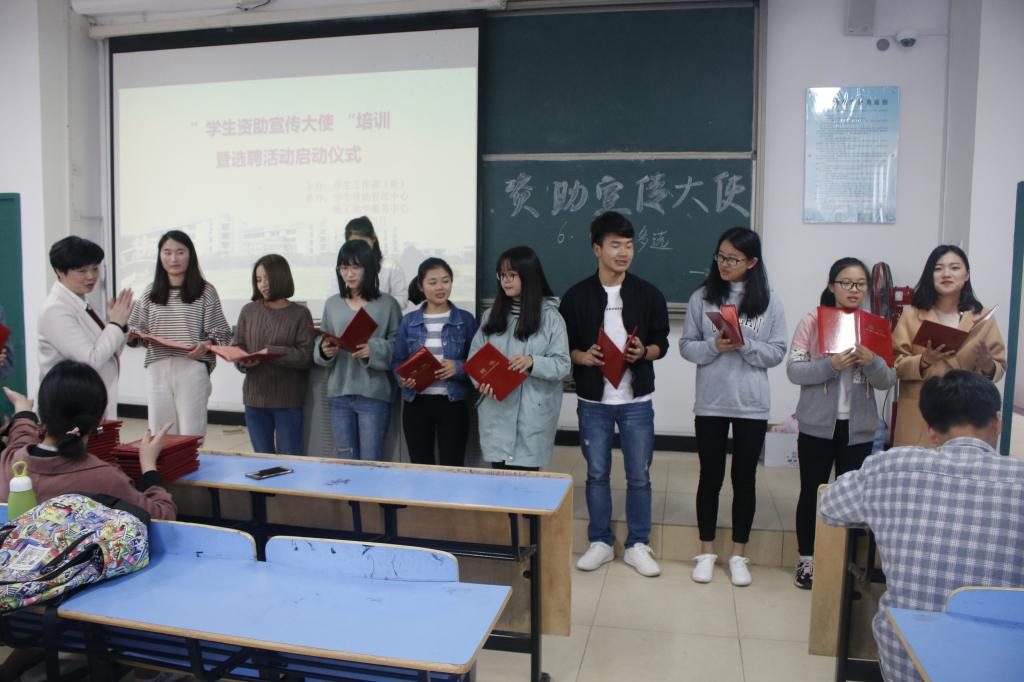 最后,学工部(处)副部(处)长龚劲丹为我校首批“学生资助宣传大使”颁发聘书,并对他们给予充分肯定,希望同学们能够担负起学校赋予的使命和责任,出色完成资助政策宣传工作任务,充分展现我校国家奖学金、国家励志奖学金获得者的优秀风采。