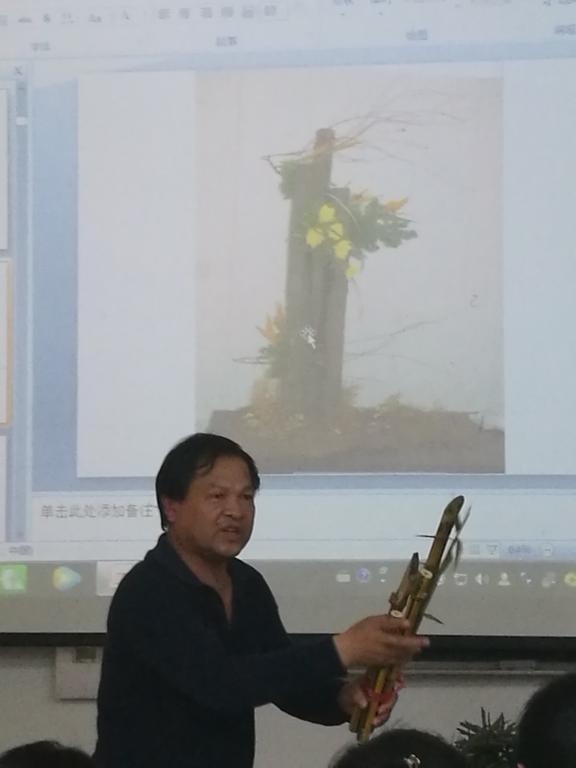 插花是“无声的诗,立体的画”,彭教授首先用妙趣横生的语言为大家详细讲解了插花艺术的概念、东西方插花的差别、不同花材的花语等知识。他并鼓励大家从身边的植物中去发现插花艺术,激发本身对美的洞察力,学会发现美、欣赏美。