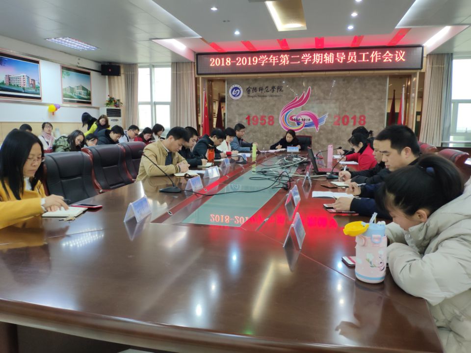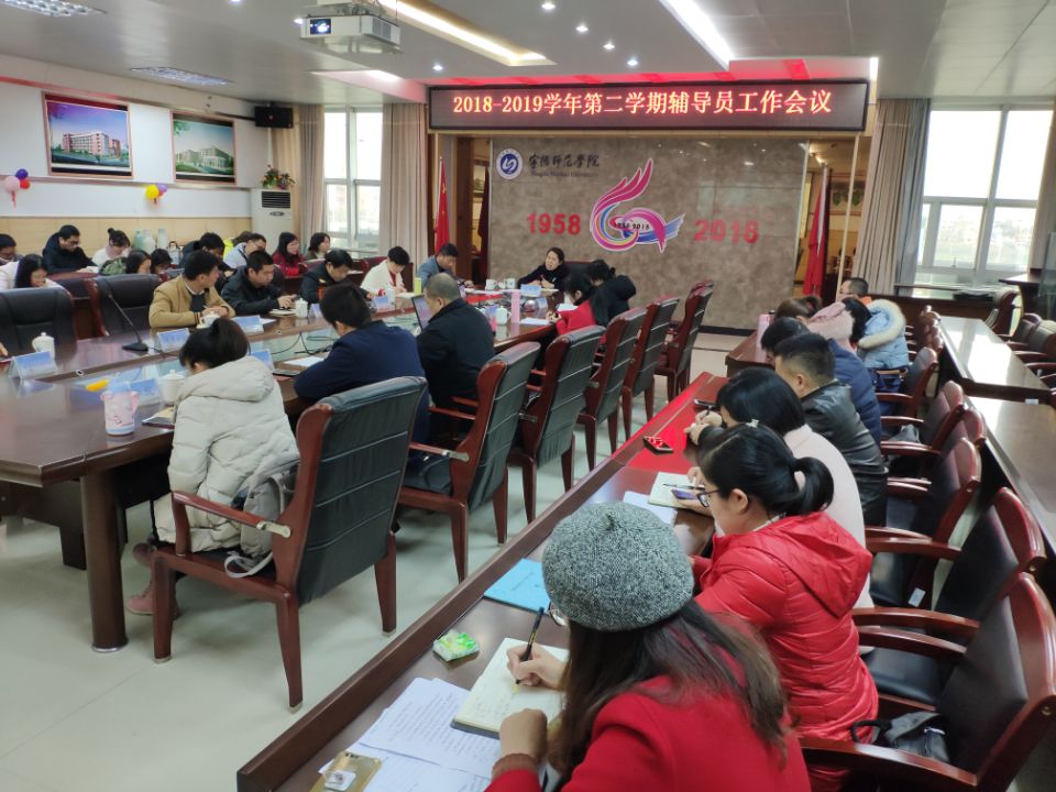 2019年2月25日下午,学生工作部(处)召开2018-2019学年第二学期期初辅导员工作会议,本次会议主题是“新学期、新目标,凝心聚力再出发”,会议主要内容有两项:第一,布置本学期学生工作重点;第二,辅导员思政论文研讨。陈旺玉副校长、学生工作部(处)全体成员、全体辅导员参加了会议。