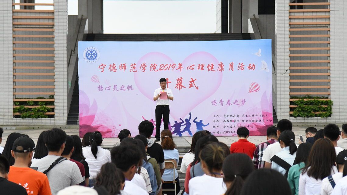 为进一步提高大学生心理健康意识,树立健康理念,积极营造健康和谐的校园氛围。 4月26日下午由校党委统战部,学生工作部(处)主办的以“扬心灵之帆,逐青春之梦”为主题的2019年心理健康月活动开幕式在图书馆前广场举行。学生工作部(处)部(处)长毛茂峰,副部(处)长龚劲丹,工会副主席邓兵,宁德市心理咨询师协会常务副会长林新霞、各民主党派代表、辅导员代表和500多位学生参加了此次开幕式。