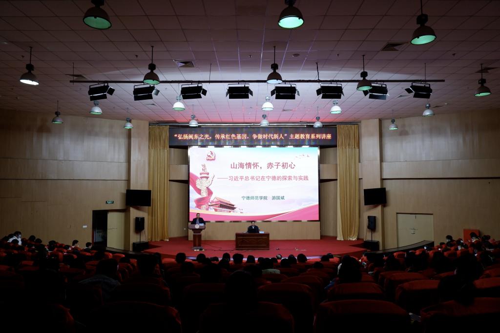 游国斌教授以“山海情怀,赤子之心”为题介绍了习近平总书记在宁德的探索与实践,主要围绕“宁德,是习近平总书记工作过的地方”、“宁德,习近平新时代中国特色社会主义思想的萌发地和实践地”、“宁德,三十年滴水穿石久久为功交出了一份美丽的答卷”等三个部分,深刻阐述了习近平总书记在宁德主政期间的生动故事及对习近平新时代中国特色社会主义思想在宁德萌发、实践的理解和认识。讲座中游国斌教授不忘时时引领青年学生,在主题教育活动中充实自己、增长才干,争做民族复兴的时代新人。