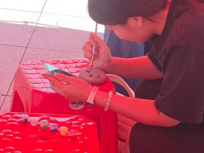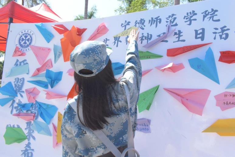10月10日,在东侨校区花海广场和蕉城校区21号教学楼同步开展“纸翼传心,墙聚希望”活动。 师生们现场用彩色纸折制纸飞机,将心愿或期许写于其上,并将纸飞机贴成“希望之墙”。 在折、写、贴的过程中,师生们抒发了内心憧憬,在集体创作中深刻感受心灵联结的力量。 “石绘心声,共护心灵”活动则采用线上线下联动的形式举办,同学们在石头上绘制图案、书写心声,以艺术创作的方式释放情绪压力,与自我对话,增强了自我关怀意识。