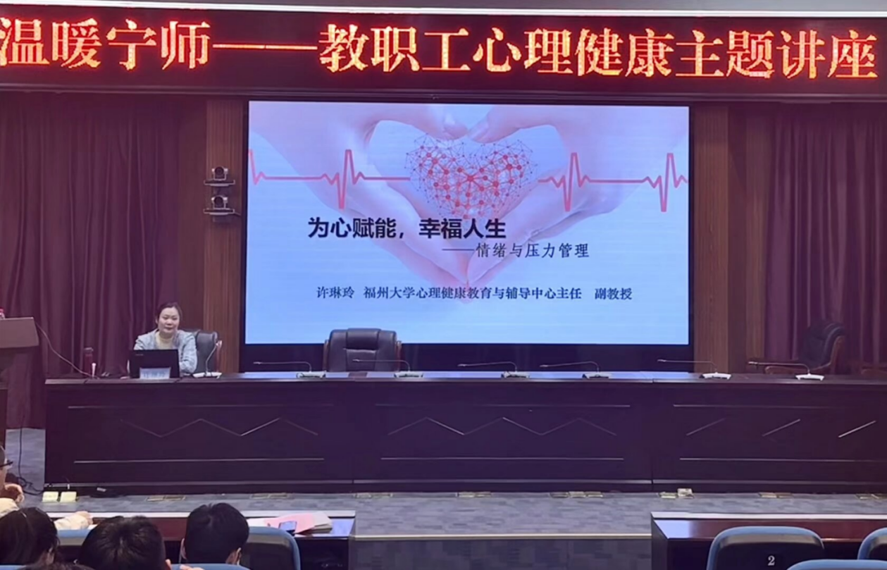 为切实加强教职工心理健康服务水平,进一步营造温暖、健康、积极向上的校园文化氛围,2025年11月13日,由学生工作处心理健康教育中心策划的“温暖宁师”润心向阳主题活动之“为心赋能,幸福人生——压力与情绪管理”专题讲座在行政楼三楼报告厅顺利举行。本次活动特邀福州大学心理健康教育与辅导中心主任许琳玲副教授担任主讲,面向全校教职工,旨在为大家提供专业、实用、有温度的心理支持。